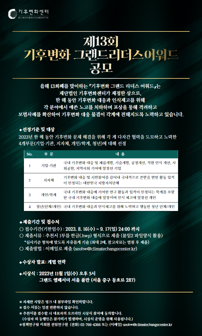 (재)기후변화센터,‘제13회 기후변화 그랜드리더스 어워드’공모…내달 17일까지