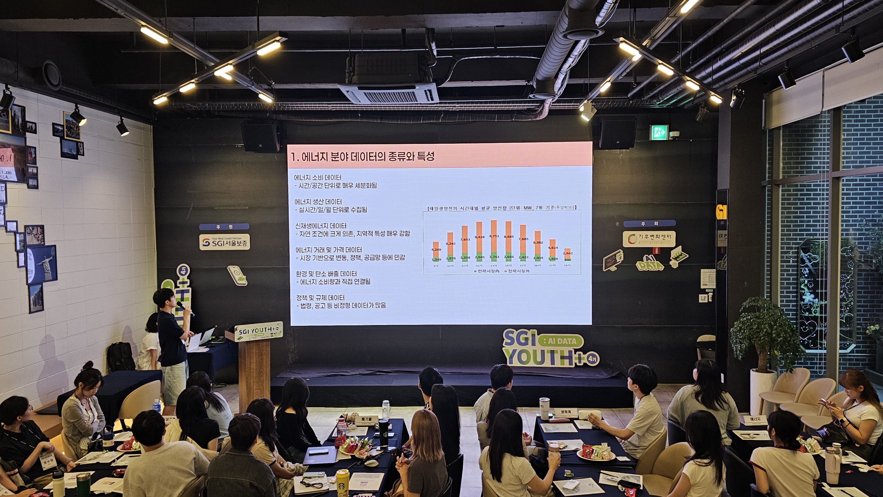이어서는 본격적인 팀 빌딩 프로그램이 진행됐습니다. SGI YOUTH+4기 참가자들은 팀 활동을 통해 서로 친목을 다지고, 동시에 본 프로그램 주제인 'AI Data'에 대한 이해를 높이는 시간을 가졌습니다. 참가자들은 4개의 팀으로 나뉘어 각 팀별로 주제를 부여받았으며, 이에 대한 자료조사와 발표를 진행했습니다. 짧은 시간에도 불구하고 각 팀은 공공 데이터를 비롯한 다양한 자료를 적극적으로 탐색하며, 주제와 연결된 정책·기술·사회적 쟁점을 정리해 발표를 마무리했습니다. 이를 통해 팀워크는 물론, 데이터 활용과 분석에 대한 기초적 이해를 함께 쌓을 수 있었습니다. 또한 ‘기후위기 시대의 AI와 데이터’라는 큰 주제 안에서 각자의 관심 분야를 구체적으로 생각해보는 실질적인 출발점이 되었습니다.