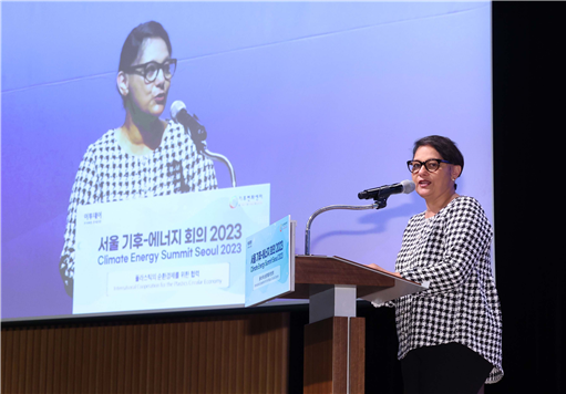 죠티 마투르 필립(Ms. Jyoti Mathur-Filipp) 유엔환경계획(UNEP) 플라스틱 정부간협상위원회(INC) 사무국장이 기조연설을 하고 있다.