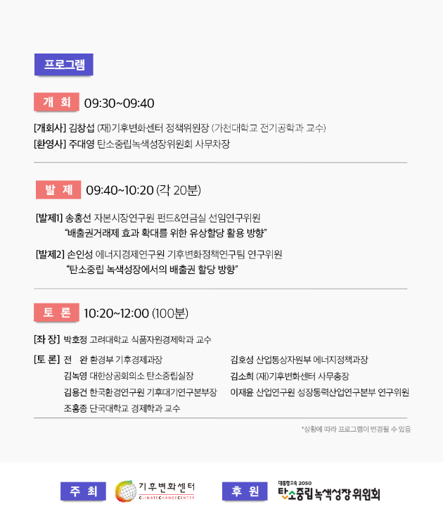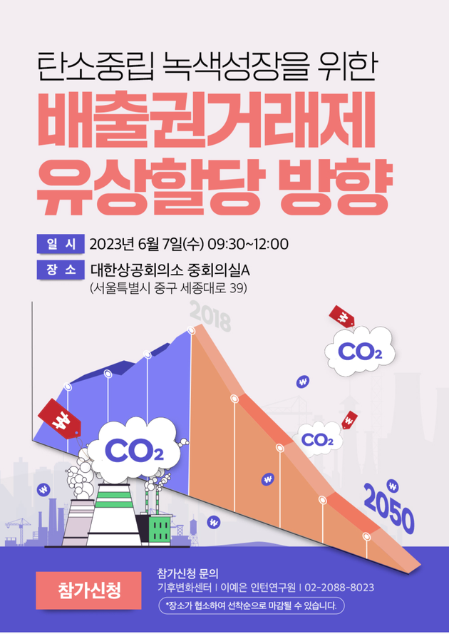이에 배출권 유상할당이 국가 탄소중립 녹색성장에 기여하기 위한 방향을 논의하는 자리를 마련했습니다. '탄소중립 녹색 성장을 위한 배출권 거래제 유상할당 방향'을 주제로 온실가스 다배출 업종(전환, 산업 부문)의 유상할당 방향에 대한 심도 있는 논의를 진행할 예정입니다. 관심 있는 분들의 많은 참여 바랍니다!